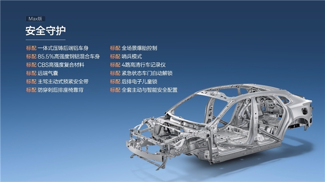 车身安全结构:全球首发四大一体式集成安全结构,包括一体式2000MPa热成型门环、一体式压铸铝CD柱强化结构、一体式热成型天窗加强环、一体式压铸后端铝车身,减少零部件和焊点,提升车身刚度和安全性。