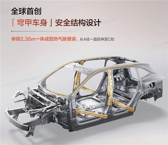 车身安全结构:全球首发四大一体式集成安全结构,包括一体式2000MPa热成型门环、一体式压铸铝CD柱强化结构、一体式热成型天窗加强环、一体式压铸后端铝车身,减少零部件和焊点,提升车身刚度和安全性。